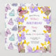 Invite your friends and family to your child's birthday party with an invitation designed by Twin Spirit Designs. The invitation features beautiful pink, purple, and yellow butterflies with pink and purple text.