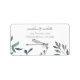 This address label design features a beautiful watercolor damselfly/dragonfly with wings in shades of purple and pink. It is resting on a simple arrangement of natural watercolor garden greenery in shades of green and blue on a white background. -