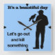Falconers live to hunt with their birds. A silhouette of a falconer with his bird. The words It's a beautiful day Let's go out and kill something surrounds them. Customisable background colour to suit your taste.
