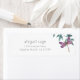 This address label design features a beautiful watercolor dragonfly with wings in shades of purple and pink. It is resting on a simple arrangement of natural watercolor garden greenery in shades of green and blue on a white background.