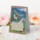 Beautiful Eagle Scripture Table Tent Sign of a colourful, detailed scene with a glorious Bald Eagle spreading its wings and flying high in the blue sky above a plush green valley next to the foothills of a mountain. This scene accompanies the Bible verse, "But they that wait upon the LORD shall renew their strength; they shall mount up with wings as eagles; they shall run, and not be weary; and they shall walk and not faint." Isaiah 40:31. This Table Tent Sign makes a wonderful gift or can be used to remind us of the Word of God.