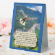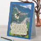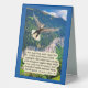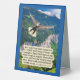 Beautiful Eagle Scripture Table Tent Sign of a colourful, detailed scene with a glorious Bald Eagle spreading its wings and flying high in the blue sky above a plush green valley next to the foothills of a mountain. This scene accompanies the Bible verse, "But they that wait upon the LORD shall renew their strength; they shall mount up with wings as eagles; they shall run, and not be weary; and they shall walk and not faint." Isaiah 40:31. This Table Tent Sign makes a wonderful gift or can be used to remind us of the Word of God.
