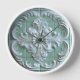 Clock has a embossed look of white ceramic, elegant floral tile on light green background tile wall.
