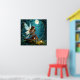 A fairy tale themed wall art featuring a fairy sitting on a mushroom in an enchanted forest being lit up by lanterns drinking a warm cup of coffee. The pretty trees are covered in sparking fairy lights and there is a full moon shining through the tree branches.