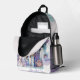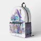 Surprise your daughter, granddaughter with this Beautiful fairy mermaid theme, white, pink, teal and purple aesthetic, custom text Backpack, designed by PiccoGrande. It features a box full of treasures, a young mermaid, in front of a mansion, and a heart-shaped gradient, mermaid scales.