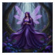 A beautiful fairy wearing a flowing purple dress and a necklace made of amethysts with violets in her long purple hair and light purple dragonfly-like wings holding a violet stands in a magical forest surrounded by colourful mushrooms, flowers and mossy, vine-covered trees.