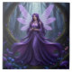 A beautiful fairy wearing a flowing purple dress and a necklace made of amethysts with violets in her long purple hair and light purple dragonfly-like wings holding a violet stands in a magical forest surrounded by colourful mushrooms, flowers and mossy, vine-covered trees.