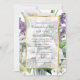 Elegant calla lily photo celebration of life invitation featuring a gold frame adorned with a floral background of purple flowers, calla lilies, orchids and greenery. A floral photo frame at the back.