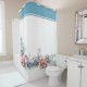 Beautiful bathroom shower curtain, with artwork of colourful garland of flowers on the bottom, with a white background. The top of the curtain has a stripe of solid peacock blue, with a peach and white border. Pretty bath decor, matching products are available.
