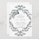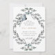 Beautiful wedding invitation features elegant calligraphy, and a rustic blue grey botanical watercolor wreath with foliage and flowers.