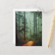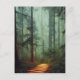 Beautiful and serene AI assisted fantasy digital art postcard features wooden path thru misty forest trees.