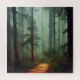 Beautiful and serene AI assisted fantasy digital artwork square puzzle features wooden path thru misty forest trees.