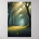 A digital painting depicts a serene forest scene with a winding path leading into the distance. The path is bathed in warm sunlight that streams through the dense canopy of trees, casting long shadows on the lush green grass. The air is filled with a soft, ethereal mist, adding to the mystical atmosphere.