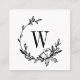 Monogrammed square business card with your initial inside an open wreath of greenery and a flower.