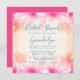 Beautiful big Hawaiian flowers bridal shower invitation template. Square card design with dark grey handwritten script for party title and bride's name. Easily add party information, registry and RSVP over a pink and yellow gold background with big frangipani / plumeria flowers at top and bottom. Reverse is solid dark pink. Other invitation sizes are available, such as round, or 5x7. Not every size will work for this design.