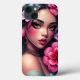 Phone case featuring a Hispanic or Latina woman with pretty pink and blue flowers in her hair. Stunning digital ai art.