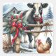 Pretty black and white cow with a red bow and cute rooster. Background has a red rustic barn and a wood fence decorated in Christmas garland. A pretty watercolor scene of a snowy winter day on the farm.