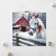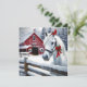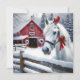 Pretty white horse with a red bow and cardinal on her head. Background has a red rustic barn with Christmas wreaths on it. A pretty watercolor scene of a snowy winter day on the farm. Back of the card can be personalised with your own holiday greeting and family names.