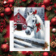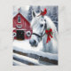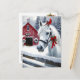Pretty white horse with a red bow and cardinal on her head. Background has a red rustic barn with Christmas wreaths on it. A pretty watercolor scene of a snowy winter day on the farm. Back of the postcard can be personalised with your own holiday greeting and family names.