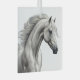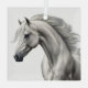 A beautiful white horse with flowing mane on a glass ornament.