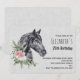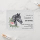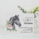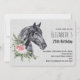 Birthday invitation with a beautiful illustration of a black horse head with a fancy floral embellishment by it's neck. Elegant and classy animal painting. Grey mottled background.