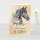 Happy birthday greeting card with a beautiful illustration of a black horse head with a fancy floral embellishment by it's neck. Elegant and classy animal painting. The background is a fancy abstract design in a light yellow colour with faux gold flecks.