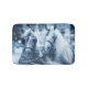 A bath mat with a photograph of a pair of horses hitched together. A snowy day and a blue filter creates a magical scene.