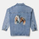 Denim jacket with a beautiful watercolor drawing. Featuring a pair of horses, brown and white. Head and neck visible with dripping paint along the base of their neck. Southwestern vibe.