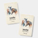 Name badge with a beautiful watercolor drawing. Featuring a pair of horses, brown and white. Head and neck visible with dripping paint along the base of their neck. Southwestern vibe.