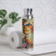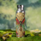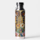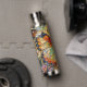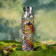 A pretty water bottle with an illustration of a beautiful gold, teal and orange butterfly surrounded by yellow, white and purple flowers. It's done with an impasto style and just emanates beauty and grace.