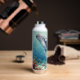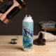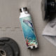A oceanic themed water bottle with a beautiful illustration of an impasto style whale swimming deep in the sea by vibrant colorful coral. A really beautiful coastal art. Colors used are teal, blue and soft coastal colors.