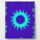 This artwork features a central, circular floral motif set against a solid, deep blue background. The floral design is stylised and sun-like, chraacterised by radiating petals or flames. The composition is simple yet impactful, emphasising the beauty of the central motif. The image exhibits a slightly textured background, reminiscent of paper.