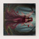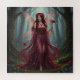 A beautiful fairy wearing a flowing red dress and a necklace and belt made of garnets with carnations and garnets in her long dark red hair and light red dragonfly-like wings holding a red carnation in each hand walks through a magical forest surrounded by fireflies, flowers and mossy vine-covered trees.