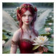 A beautiful red haired fairy with white wings wearing a pretty red dress and a ruby necklace holds a single water lily while standing in a pond full of water lilies.