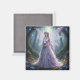 A beautiful fairy wearing a flowing lavender dress and a necklace made of pearls with roses in her long lavender hair and light purple dragonfly-like wings holding a rose stands in a magical forest surrounded by blue and purple flowers and moss-covered trees.