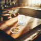 This beautiful leaf or tree in a cup of latte is carefully made by baristas pouring cream into a cup of espresso. A brown dotted border surrounds it.