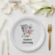 Birthday paper plates with a beautiful illustration featuring a grey, black and white leopard portrait. This lovely animal is surrounded by a tropical flower bouquet. Elegant, exotic and lovely.