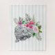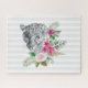 A puzzle with a beautiful illustration featuring a gray, black and white leopard portrait. This lovely animal is surrounded by a tropical flower bouquet. Elegant, exotic and lovely.