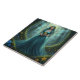 A beautiful fairy wearing a flowing teal dress and a necklace made of aquamarine stones with daffodils and aquamarines in her long teal-coloured hair and light teal dragonfly-like wings holding a daffodil stands in a magical forest surrounded by blue mushrooms, yellow daffodils and mossy trees.