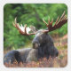 Beautiful moose with big antlers laying on the ground with green trees in the background. Great gift for your mother, father, sister, any other relative, loved person, yourself in birthday, anniversary, Christmas or any other special day.