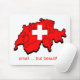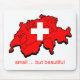 Red map of Switzerland with the white Swiss cross over it. Type underneath says "small ... but beautiful". A very good way to describe the country..a lot of impact for the size.