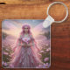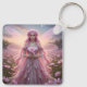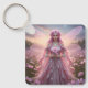 A beautiful fairy wearing a flowing pink dress and a necklace made of opals with opals and cosmos flowers in her long pink hair and light pink dragonfly-like wings holding a pink cosmos flower stands in a magical field of cosmos flowers surrounded by bubbles against an afternoon sky.