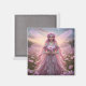 A beautiful fairy wearing a flowing pink dress and a necklace made of opals with opals and cosmos flowers in her long pink hair and light pink dragonfly-like wings holding a pink cosmos flower stands in a magical field of cosmos flowers surrounded by bubbles against an afternoon sky.