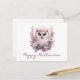 Emblazoned across the top of the postcard are the words "Happy Halloween," elegantly scripted to complement the overall design. The festive greeting adds a touch of whimsy and celebration, making it perfect for spreading Halloween cheer. The combination of the owl, floral elements, and festive text creates a postcard that is both captivating and delightful.