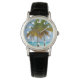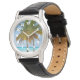 A watch with a beautiful and tranquil photograph of 2 palm trees under a bright blue sky.