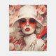 Beautiful Parisian woman in a white hat and red sunglasses with modern abstract background. Female elegant fashion art portrait.