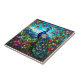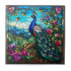 Beautiful Peacock 2 Among Flower Garden features a colourful peacock perched in a tree with it's tail feathers flowing down against a background of rich foliage and hills and flowers blooming done with a stained-glass effect on a ceramic tile. There are many uses for these wonderful ceramic tiles.