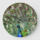 Closeup photo of a beautiful peacock displaying his tail clock with numbers.