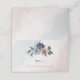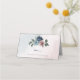 Beautiful botanical wedding place card featuring pink, dusty blue and navy blue flowers with green leaves.