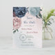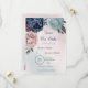 Beautiful botanical birthday party invitation featuring pink, dusty blue and navy blue flowers with green leaves.